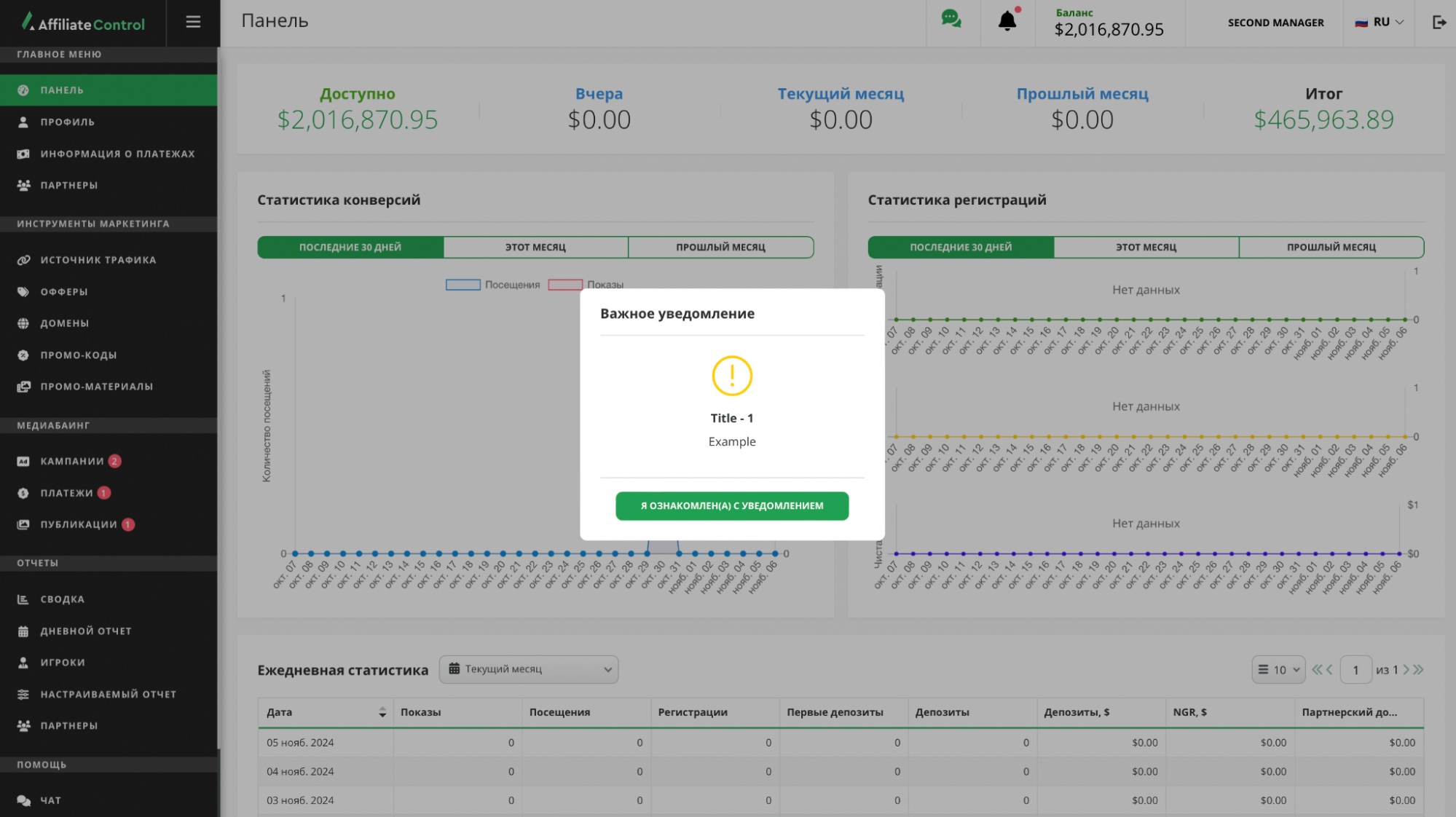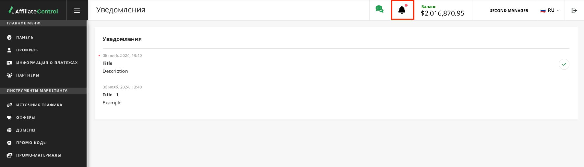 Партнерская программа может отправлять уведомления с целью известить партнера о важной информации, например: акции, новости и пр.
