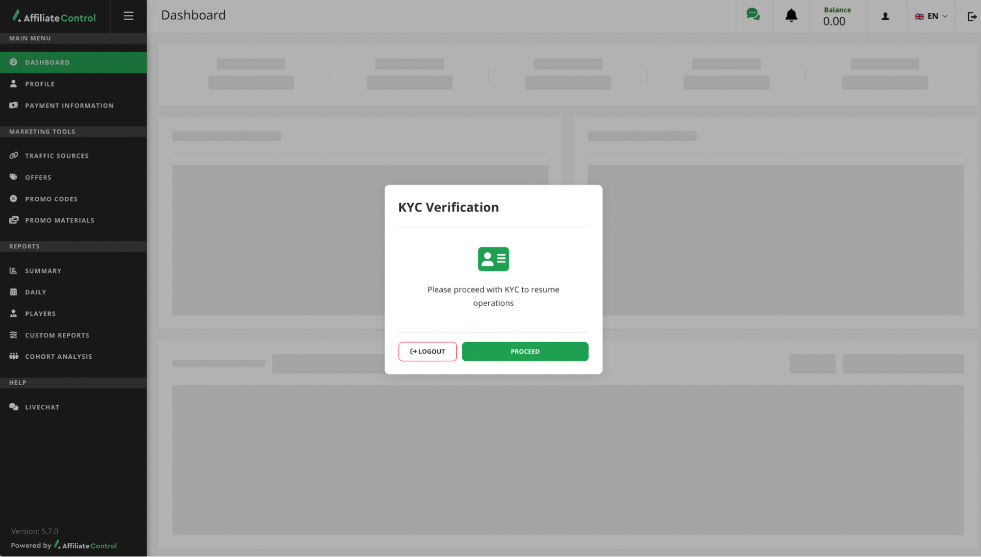 If one of the scenarios is triggered, a notification will appear in the affiliate account with the following text: «Please proceed with KYC to resume operations».