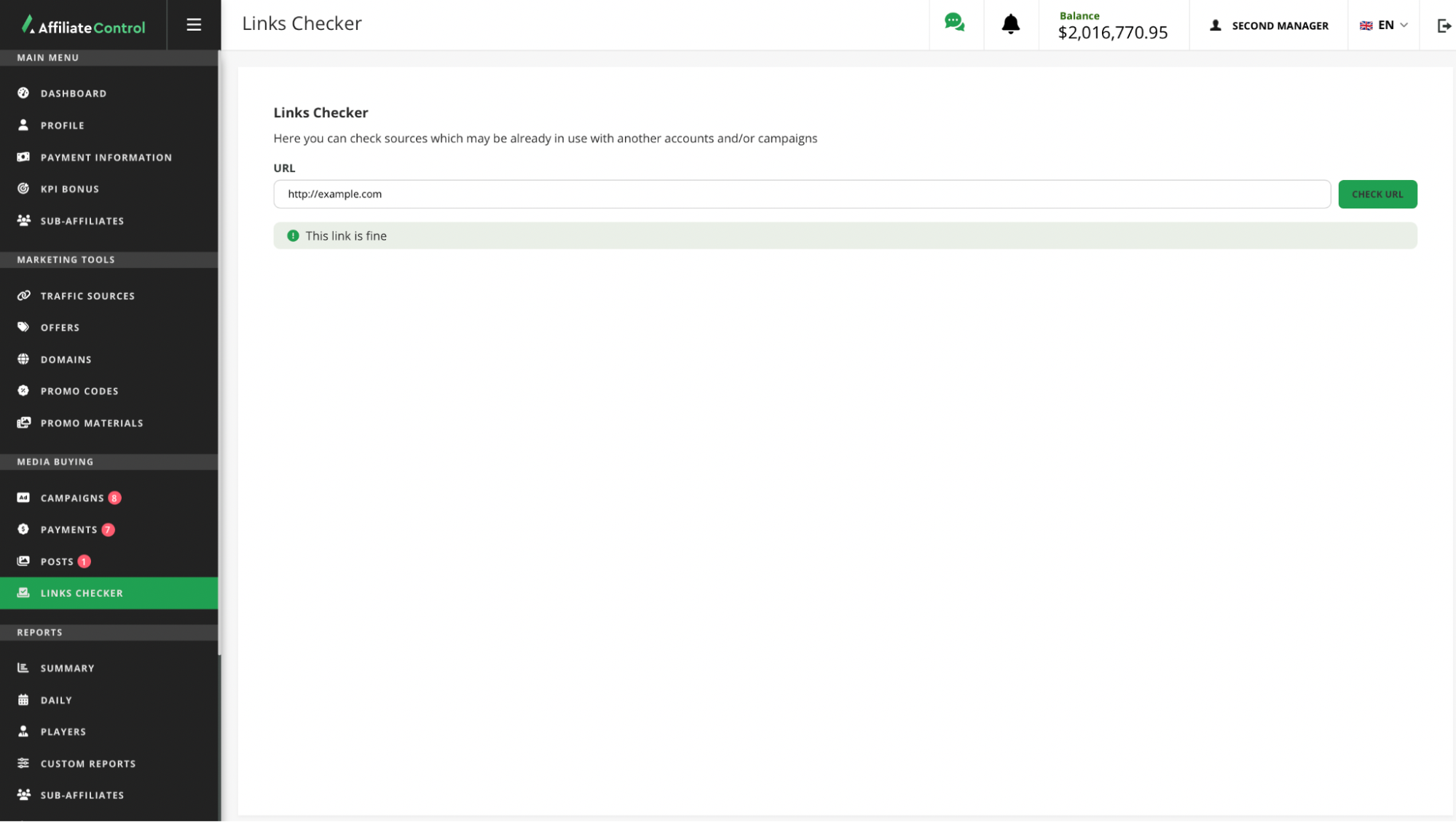 In this subsection, the affiliate can check whether the link to his source is blocked by the affiliate program. If the URL is blocked, the affiliate will not be able to request payment for the media buying campaign.