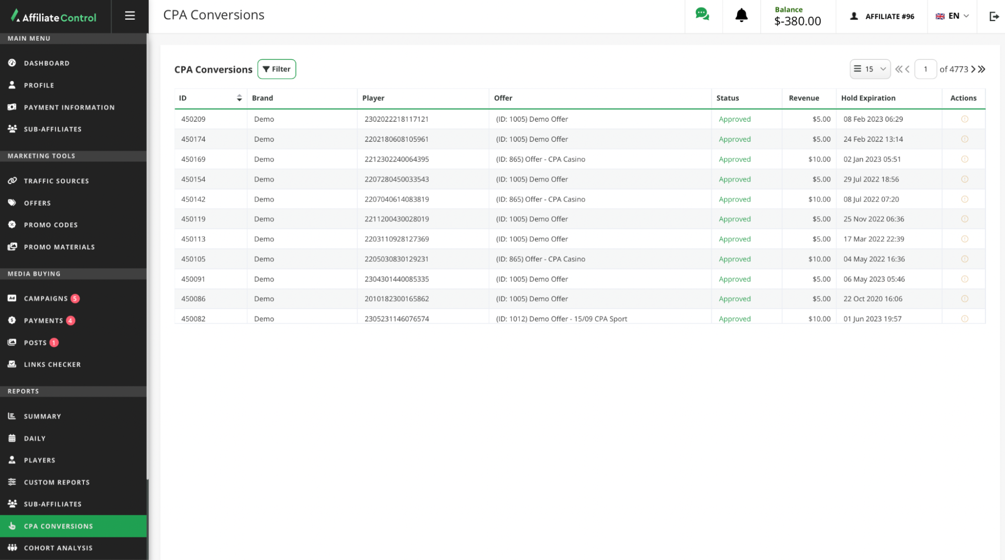 It is possible to filter the list by attributes to generate the required list of conversions, such as: brand, affiliate, offer, status.